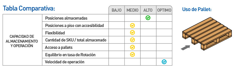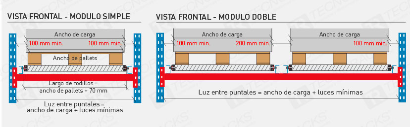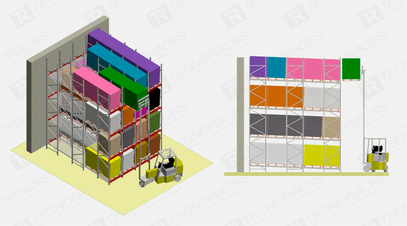 Sistema de acumulación donde se carga y descarga es frontal (LIFO) los pallets son depositados sobre cunas de rodillos, ligeramente inclinadas, y por empuje se almacenan en profundidad. En la descarga, el pallets ubicado por detrás del retirado, avanza debido al plano inclinado.