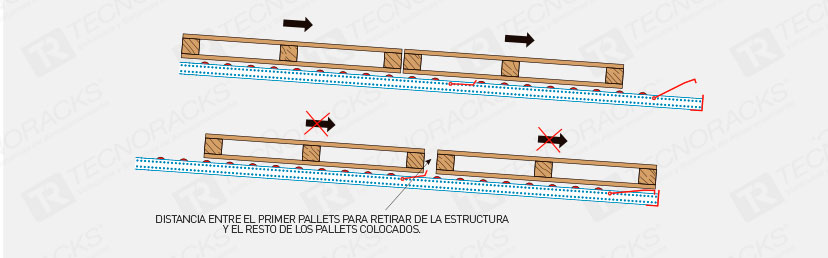 Permite separar el primer pallets a retirar de la estructura, sin la presión de linea ejercida por el resto de los pallets, logrando más seguridad y agilidad en la operación. Esto es más notable en los niveles superiores de la instalación. Evita el roce vertical producido al ser retirado un pallets.