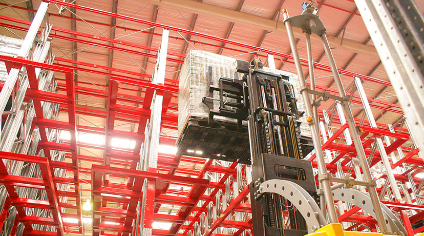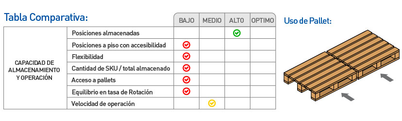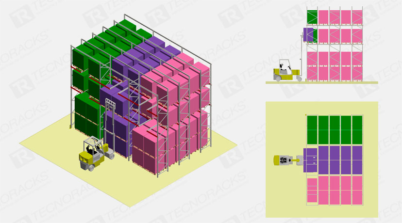 Es utilizado con vehículos que pueden trasladar 2 pallets por vez. Esto aumenta significativamente la productividad y se logra grandes volúmenes de almacenamiento.