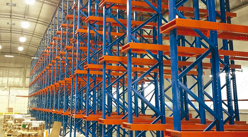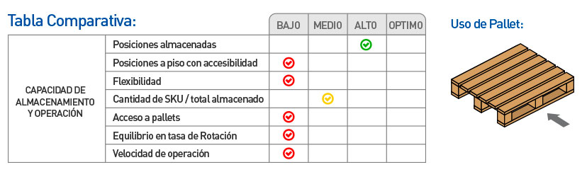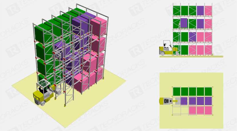 Sistema de acumulación estática que reduce el requerimiento de espacio en un 35%, con respecto a un sistema de Racks Selectivo. El equipo de elevación ingresa a la estructura para almacenar la carga.