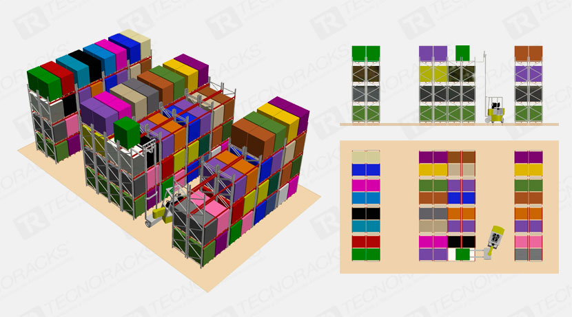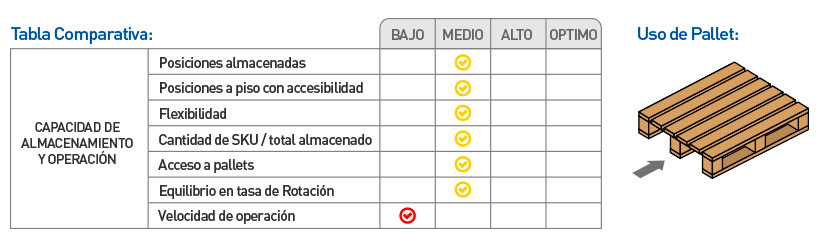 La ventaja más importante de este sistema es reducir los pasillos de trabajo hasta en un 60%, optimizando el área disponible y aumentando la capacidad de almacenamiento. Este sistema debe utilizarse con un auto elevador con horquillas extensibles.